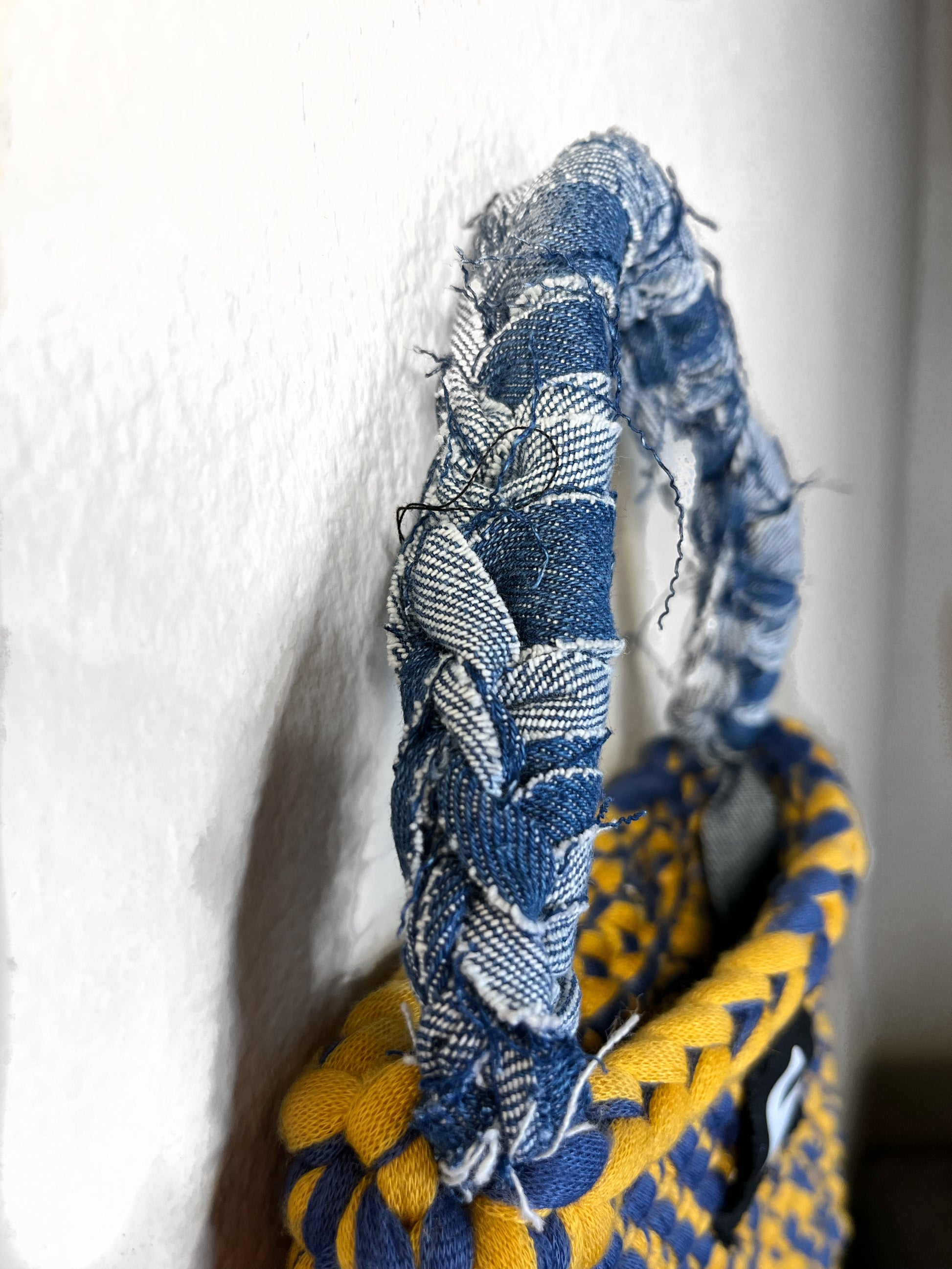 This handmade crochet handbag is perfect for storing your small daily essentials while on the go. Its body is made of t-shirt yarn, and it features a denim crocheted handle, and a label with our logo.